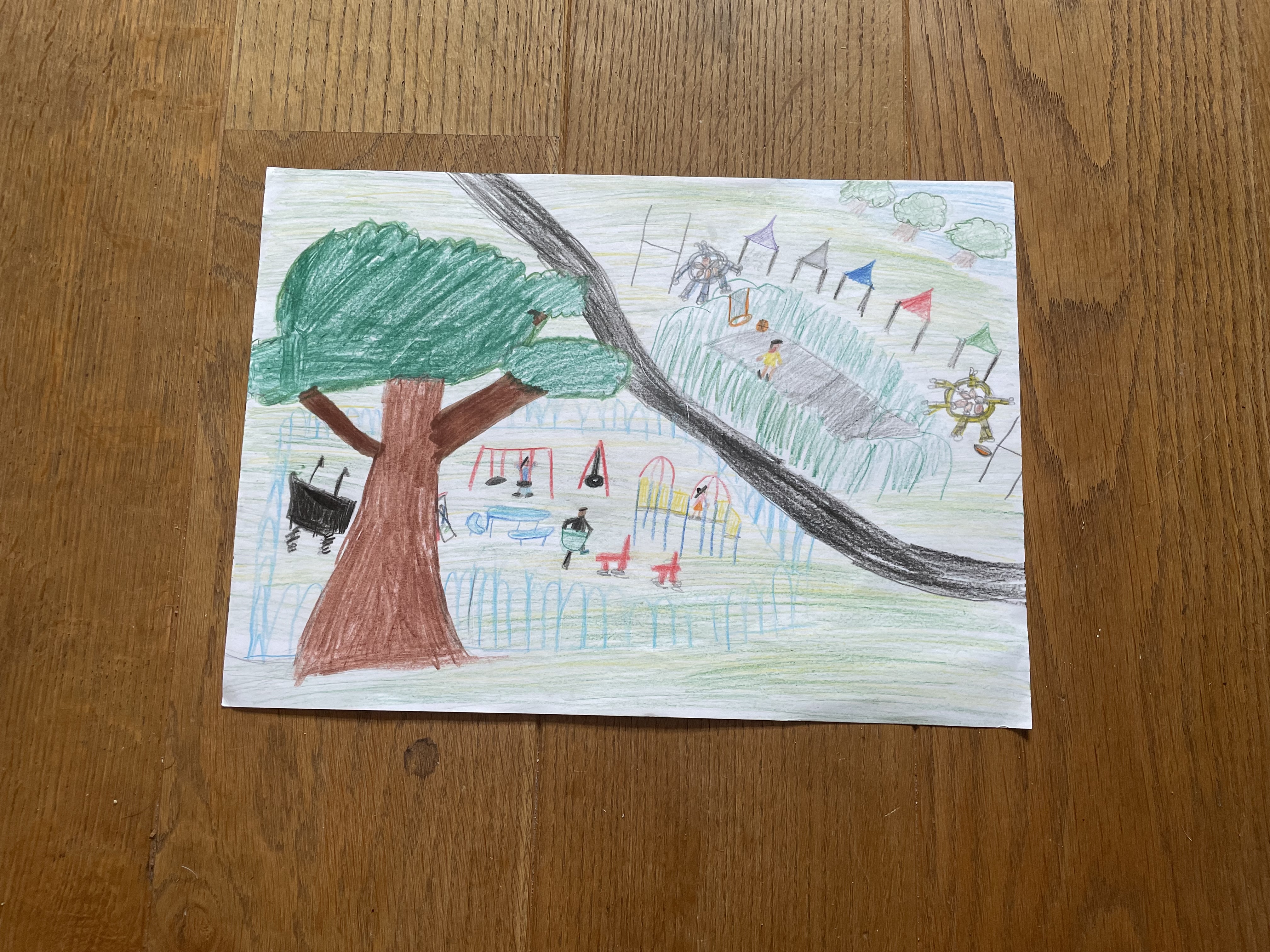 We loved that the park means something different to everyone. But there were some motifs that kept popping up. The river Wandle, our rare chalk stream, featured in lots of our art, including all 3 winning pictures. And the playground was a recurring theme. But an unexpected feature were our stunning electricity pylons, bringing a brutalist modernism to the landscapes.