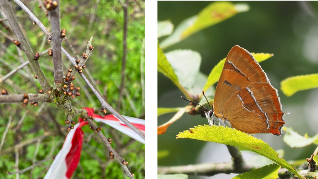These butterflies lay their eggs on young blackthorn shoots and their caterpillars look like blackthorn leaves. The eggs are like tiny spots of tippex at the juncture of branches. Keen eyed volunteers identified trees with eggs and marked them so we didn’t cut them down while doing other tasks.